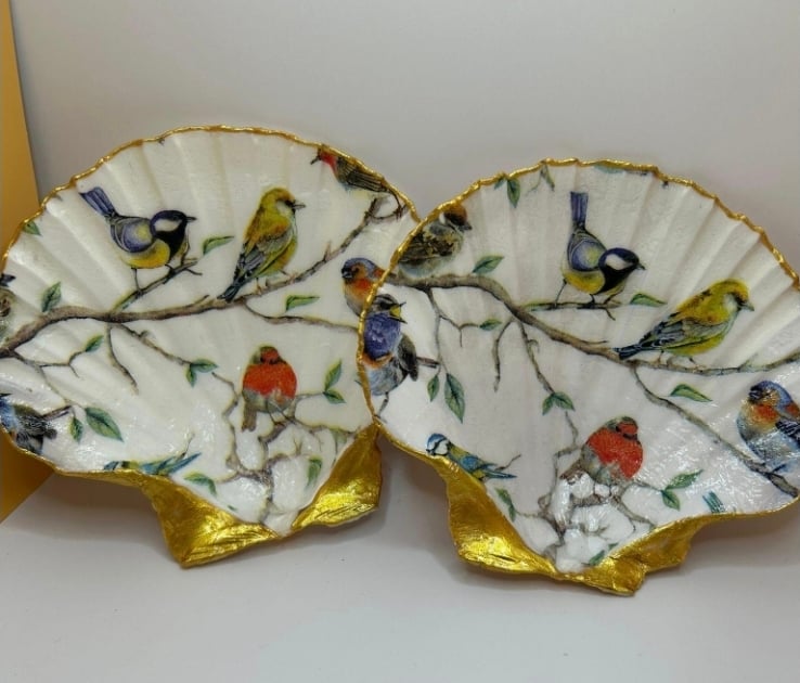 Garden bird scallop shell. Finished with a water resistant gloss. Clean with a damp gloss.