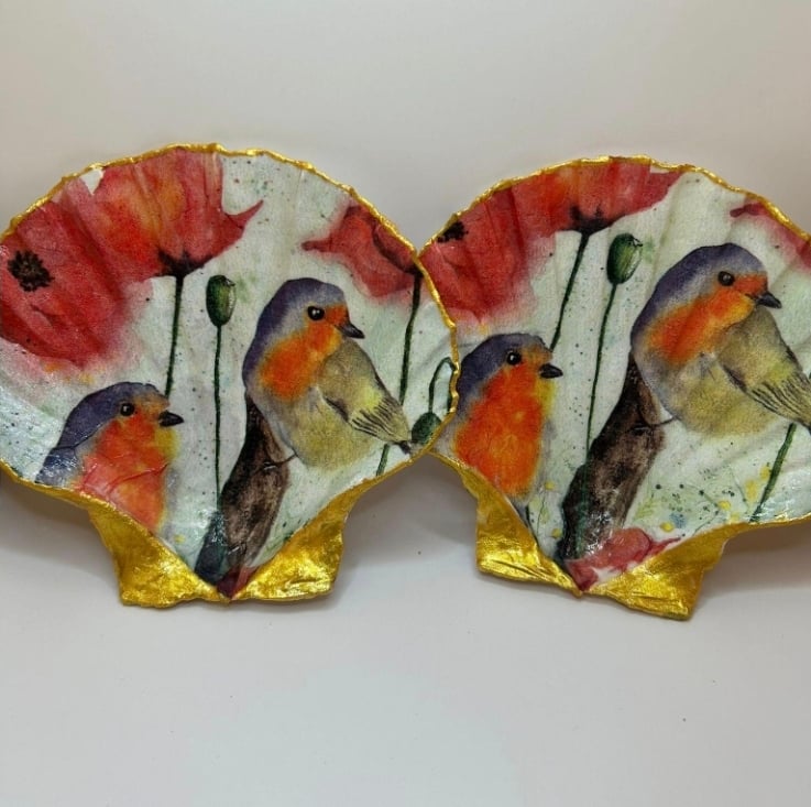 Robin scallop shell. Finished with a water resistant gloss. Clean with a damp cloth.